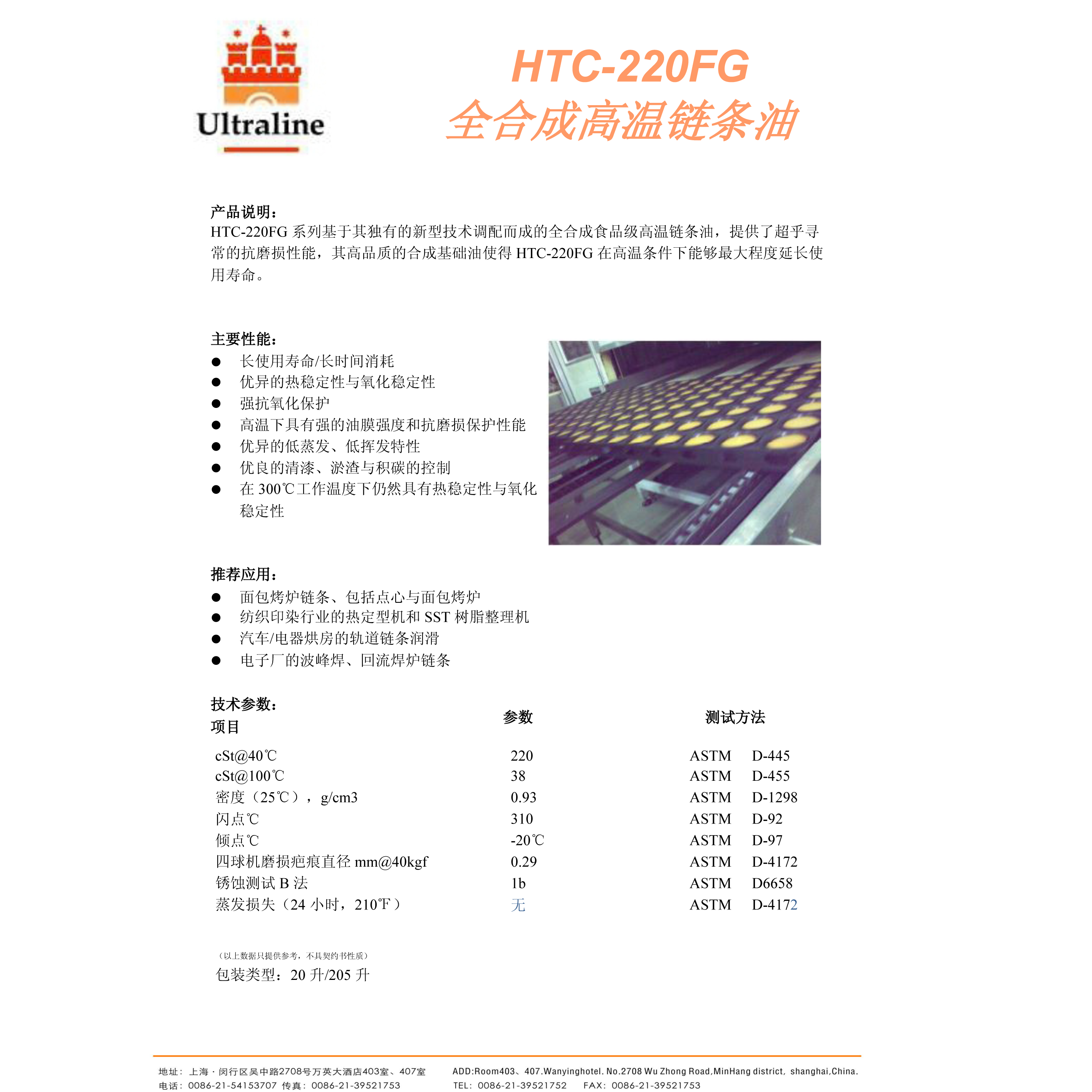 HTC-220FG系列基于其獨(dú)有的新型技術(shù)調(diào)配而成的全合成食品級(jí)高溫鏈條油。