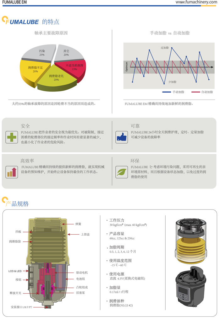 FUALUBE EM是內(nèi)置齒輪式驅(qū)動(dòng)系統(tǒng)的機(jī)械式自動(dòng)加脂器,采用更換式潤滑脂袋及電磁組可重復(fù)使用,使用兩個(gè)按鍵輕松設(shè)定,并且為了用戶的便利性采用LCD屏幕及LED燈,可方便地索取數(shù)據(jù)及工作狀態(tài)的用戶友好型產(chǎn)品,以60kfg/cm2的強(qiáng)力工作壓力,可安裝最長10m遠(yuǎn)程距離的位置上,也安裝最多8個(gè)點(diǎn)的加脂位置上,精確潤滑還可以提高能源效率。我們將幫助您最大程度地實(shí)現(xiàn)潤滑功效。